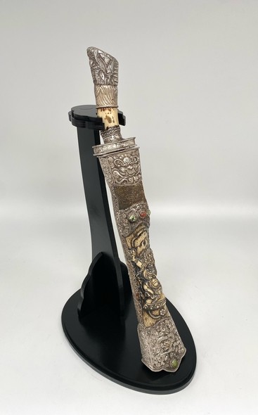 Antique dagger in a sheath with a belt loop. Bone, metal, leather, silvering. Tibet, 20th century.The blade of the dagger is made of steel, on which are applied images of a tiger and a dragon - two of the four main mythical sacred animals of the eastern pantheon. The handle is bone, metal, silvering with an image of a dragon applied to it.The sheath is metal, with bone trim in the form of an image of the goddess Kali - cosmic energy (Krodha Kali in Tibet in Buddhism), the goddess of death, rebirth, the Great Mother in her dark incarnation, the most powerful form of life and the wife of Shiva.The sheath is decorated with an image of a dragon, the main symbol of Tibet, from which the ruling dynasties descended. The leather in the upper part is stylized as dragon scales.The reverse side of the sheath is trimmed with leather and has a metal belt loop. The stylization of the item speaks of the high origin of its owner and his status.