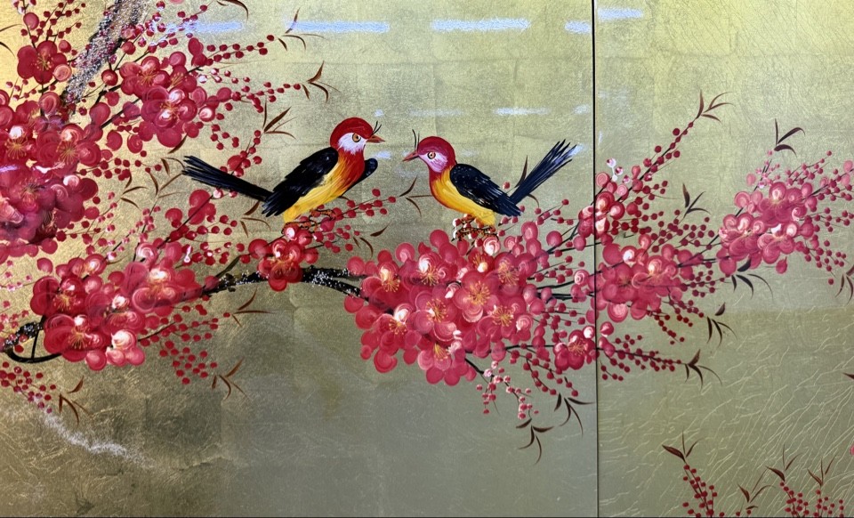 Винтажное панно «Сакура» с обложки было создано ориентировочно в 1980-е годы. Первая панель, слева, изображает корни древнего вишнёвого дерева, уходящие в золотую землю. Здесь поталь ложится мягкими волнами, имитируя рассвет над горой Фудзи, а красные наброски ветвей намекают на пробуждение. Вторая панель раскрывает полное цветение. Ветви сакуры взмывают вверх, усыпанные алыми бутонами, а две маленькие птицы — символы верных спутников, возможно, влюблённых душ — парят среди лепестков. Позолота здесь блестит ослепительно, отражая лучи полуденного солнца. Это кульминация — момент радости и гармонии, когда природа шепчет о вечной красоте. Третья панель несёт оттенок меланхолии: лепестки начинают опадать, ветви гнутся под весенним ветром, а птицы улетают, оставляя следы в золотом небе. Поталь здесь приглушена, создавая иллюзию сумерек, и красный цвет угасает, перетекая в тени. Наконец, четвёртая панель, справа, завершает цикл возрождением. Корни и ветви сливаются в едином золотом сиянии, где красные акценты обещают новый расцвет.