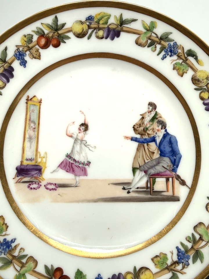История этой части старинного сервиза началась в 1827 году, когда князь Николай Борисович Юсупов купил в Париже чайный сервиз, а также заказал к нему дополнительно десертные тарелки. Тарелки соответствующей формы были выполнены из того же типа фарфора, как и чайные пары, а после доставки покупки в Россию изделия попали в Юсупосвские мастерские, где их расписали и покрыли золочением. Для декора борта тарелок живописцы мастерской в качестве образца использовали печатный декор предметов парижского сервиза, зеркало тарелок расписывали, используя гравюры из усадебной библиотеки князя. Примечательно, что ручная роспись на борту тарелки намеренно копирует стиль деколи того времени с нарочито выписанными черными контурами-штрихами на стеблях и фруктах. Изображенный на центральном фрагменте тарелки сюжет относится к подтипу жанровых, в документах ему дано условное название «Урок танца». На дне тарелки изображены три фигуры: с одной стороны — совершающая танцевальный элемент девочка в белой тунике, с другой — двое мужчин, наблюдающих за ней. Джентльмен со скрипкой, скорее всего, является учителем танцев, а мужчина в бежевом плаще около него — родственник девочки, который пришел посмотреть на результаты воспитанницы. Для более эффективного усвоения урока напротив ученицы стоит зеркало, где она может видеть все свои движения. Доподлинно не ясно, имеет ли изображенные какое-то отношение к семье Юсуповых или это только абстрактные образы.
