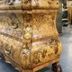 Антикварный комод в стиле Людовика XV. Выполнен из ореха с несколькими видами тонировки, декорирован сложным рисунком в технике маркетри. Корпус фигурной формы (один из вариантов формы «бомбе»), комод на три ящика. Сверху – деревянная столешница изогнутого контура, декорированная маркетри. По бокам – выступы с S-образными изгибами. Царга с резным рельефом в центре – также изогнутой формы. Фасад и торцы декорированы набором маркетри в виде цветочных и лиственных побегов. Подобные комоды чаще встречаются в северном регионе Европы (северная Германия, Голландия, Дания). Европа, XX век.